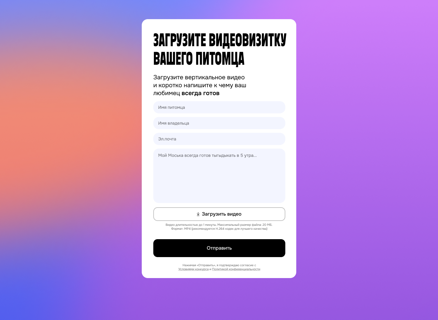 До 19 апреля загрузите видео на сайт и заполните остальные поля заявки: ваши данные, имя вашего питомца и короткое описание, к чему он всегда готов.