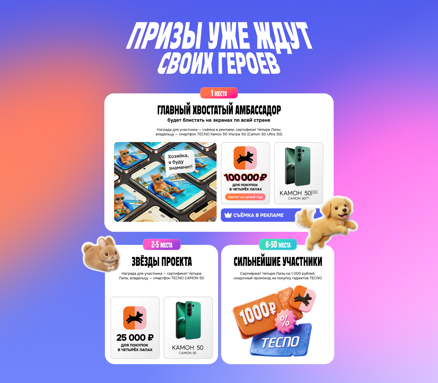 ⭐️ Призёрам, занявшим 2–5 место, достанутся сертификат на 25 000 ₽ в Четыре Лапы и смартфон TECNO Camon 50